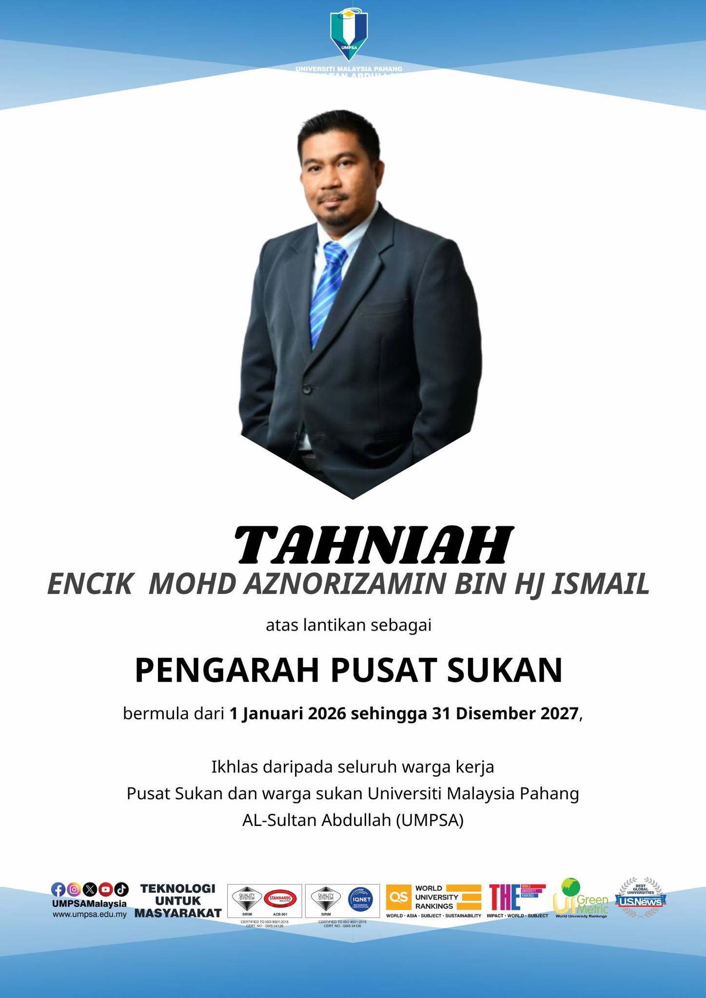 Ucapan tahniah kepada Encik Mohd Aznorizamin bin Hj Ismail atas lantikan sebagai Pengarah Pusat Sukan Universiti Malaysia Pahang Al-Sultan Abdullah(UMPSA) bermula 1 Januari 2026 sehingga 31 Disember 2027.